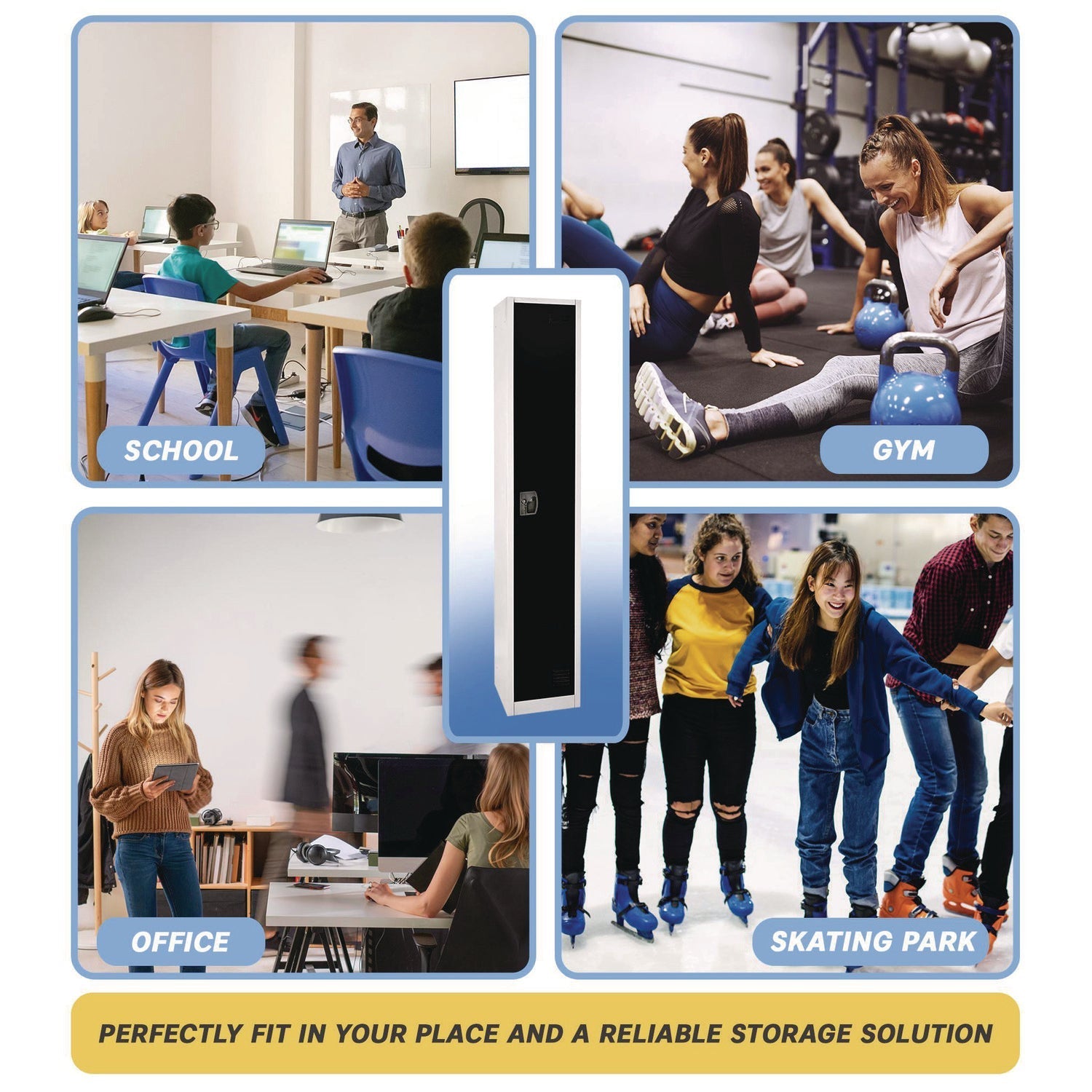 - Lockers are constructed with steel framing and sides, with rubber feet on the bottom for durability.